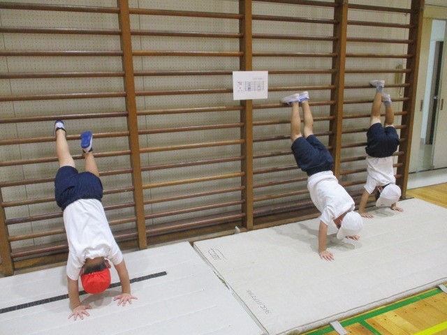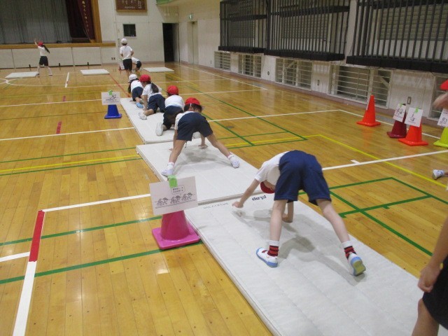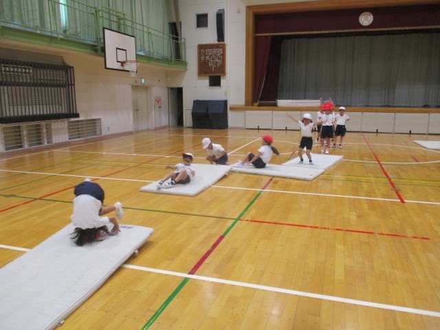 体育では、マットを使って、いろいろな方向へ転がったり、腕や背中で支持して逆立ちや川とびなどをしたりしています。