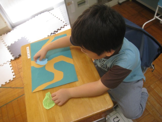 色を塗った木片を組み立てたり、作品を置く台紙を作ったりしました。