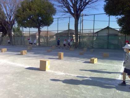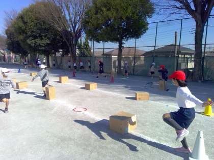 「もっと面白くしてみよう。」「ここの間隔は狭くしてみよう。」などと自分たちで工夫してコースを作り、楽しみながら取り組んでいました。