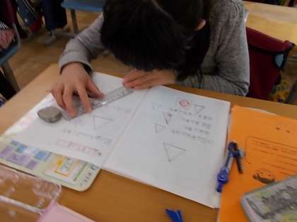 二等辺三角形や正三角形の辺の特徴を理解して、作図に挑戦しました。