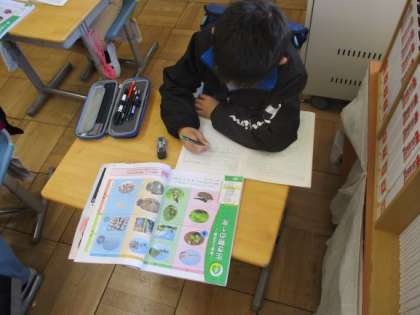 「季節によって、植物や動物の様子はどのように変わってきたのだろうか」という課題から、今年度観察していた“サクラ”や“ヘチマ”の記録などを頼りに、生き物の1年について結論を考えていきました。