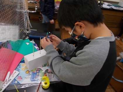 図工では、「ゴムの力でクルクル」の学習をしました。