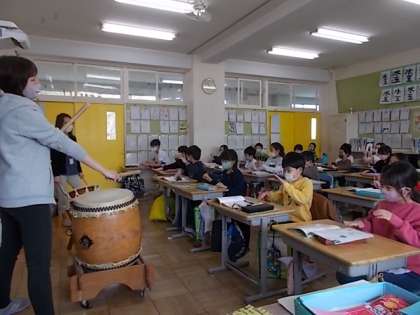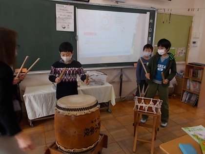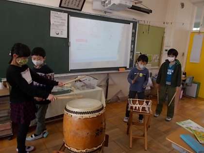 日本に伝わるいろいろな音楽を知り、「和太鼓」の演奏体験も行いました。