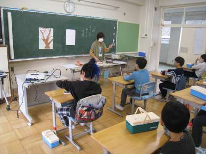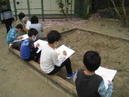 中庭の桜の木をじっくりと見つめて、幹や枝の様子をスケッチしました。
