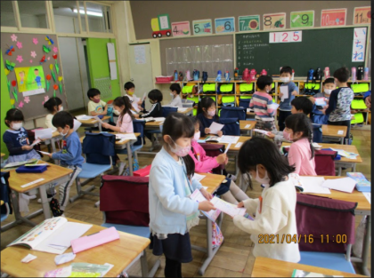 【1年生・4月16日】国語 公開日 2021/04/16 更新日 2021/04/16 学校日記 「どうぞ よろしく」の学習ではまず自分の名前と好きなものをカードにかき、次の時間にそのカードを交換し合う活動をしました。色々な友達と楽しみながら、「〇〇です。どうぞよろしくおねがいします。」と丁寧な言葉づかいで自己紹介をし合っていました。 1年