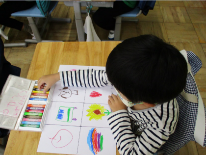 図工の「すきなもの いっぱい」では、初めてクレヨンを使って絵を描きました。たくさんの色を使いながら、それぞれの好きなもの(動物や植物、食べ物など)を楽しそうに描いていました。