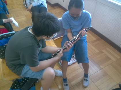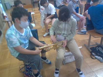 【6年生・5月17日】音楽 公開日 2021/05/18 更新日 2021/05/25 学校日記 6年生は音楽の授業で、オーケストラについての学習をしています。 今回の授業では、実際にバイオリン・フルート・クラリネット・トランペットの4つの楽器を触ることができました。 興味深く観察し、中にはバイオリンの音が上手く出せた児童もいました。 6年 専科