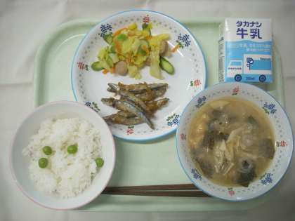 ・野菜とウインナーの炒め物 ・若竹みそ汁 ・牛乳