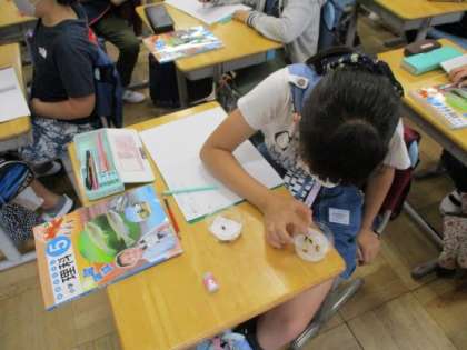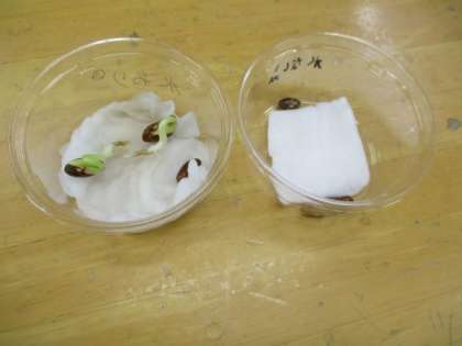 昨年度のヘチマの観察を思い出しながら、インゲンマメの種子の発芽にはどのような条件が必要なのかを考え、実験しています。予想や実験方法には、根拠をもって取り組むことで、より考えが深まっていくことを伝えています。
