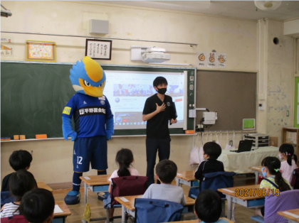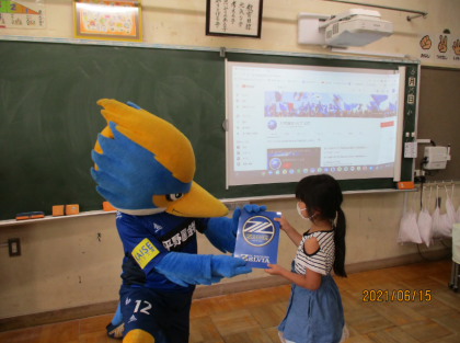 町田市を拠点としているサッカークラブ、FC町田ゼルビアのマスコットキャラクターのゼルビーくんが南つくし野小学校に来てくれました。