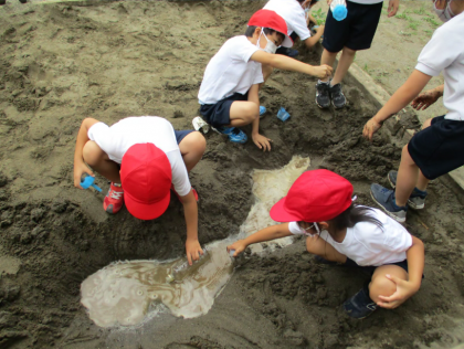 【1年生・7月8日】図工 公開日 2021/07/08 更新日 2021/07/08 学校日記 図工の「さらさら どろどろ いいきもち」では、中庭の砂場で造形遊びをしました。 砂を掘ったり、積んだり、丸めたりしながら砂のさわり心地を楽しんでいました。 1年