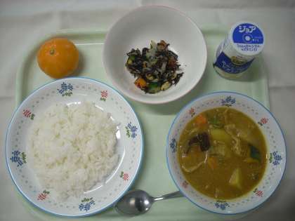 【給食・7月9日】 公開日 2021/07/09 更新日 2021/07/09 学校日記 〔7月9日の献立〕まち☆ベジメニュー ・夏野菜カレーライス ・青大豆とひじきのサラダ ・冷凍みかん ・乳酸飲料 今日は、町田産の野菜(ナス、トマト、かぼちゃ、にんじん、玉ねぎ、じゃがいも)を使ったカレーです。全体的によく食べていました。 給食