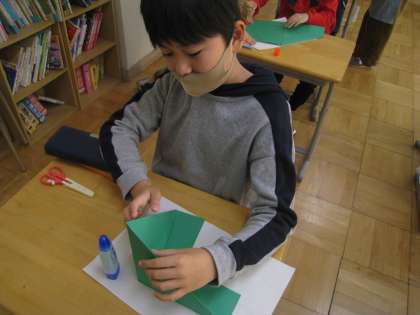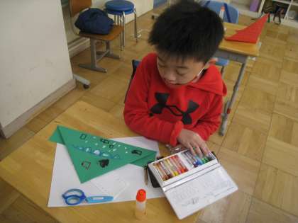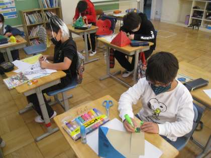 選んだ色画用紙に、自分のイメージする絵をかいて組み立てます。