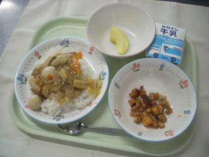 カリカリあげは、さつまいも、ごぼう、大豆をそれぞれ揚げて、たれをからめました。