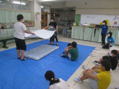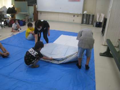 宿泊に向けて、布団の敷き方・畳み方の練習をしました。