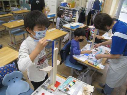 組み立てた木に 絵の具で色を塗りました。