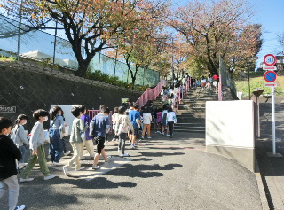 【11月11日・全校】避難訓練(二次避難有) 公開日 2022/11/11 更新日 2022/11/11 学校日記 今回の避難訓練は、二次避難場所まで移動する訓練です。地震で校庭へ避難した後、火災が発生し、二次避難場所のつばき公園へ向かいました。交通安全にも気を配り、「お・か・し・も」を守って避難できました。「まだ大丈夫!を疑って、自分の命を守る」ことについてお話しました。 全学年