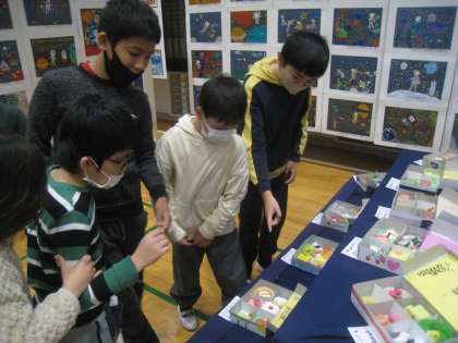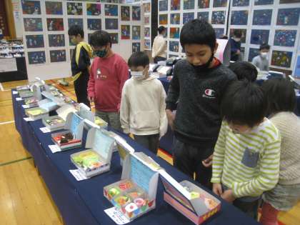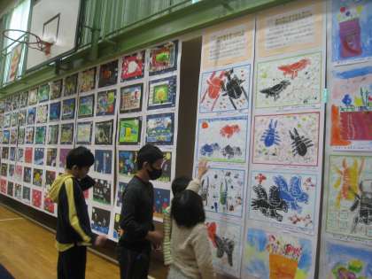 体育館中に飾られた たくさんの作品を見て、みんな 驚いていました。