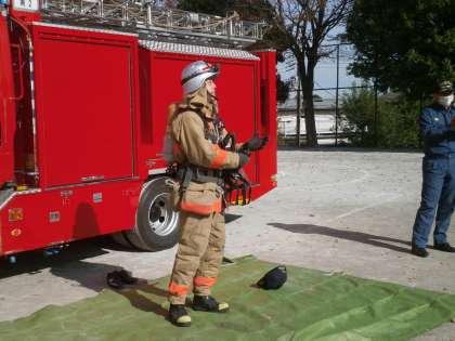 防火衣の早着替え、タンカづくり体験、消防車に積んでいる荷物の紹介など、貴重な体験をさせていただきました。