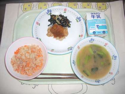 【給食・11月28日】 公開日 2022/11/28 更新日 2022/11/28 学校日記 【11月28日のこんだて】 ○もみじごはん ○とり肉のおろしだれ ○のりごまあえ ○きのこのみそ汁 ○牛乳 給食
