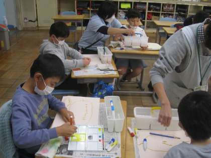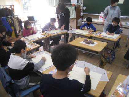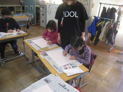 目の前のサツマイモを見ながら クレヨンで形や穴を描きました。