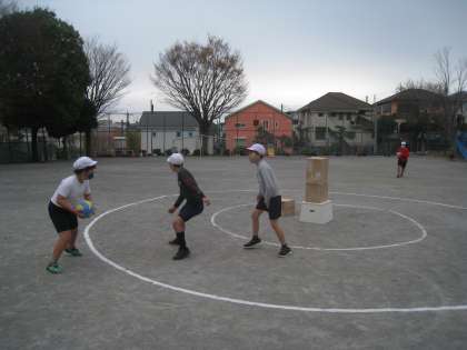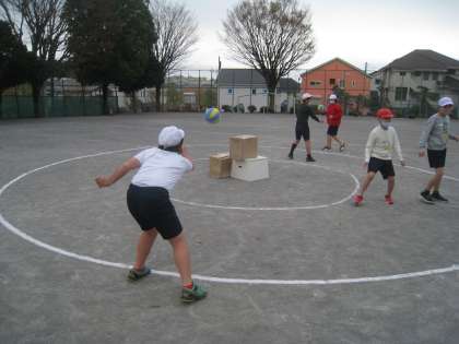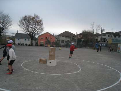 ボールを力強く投げられるようになってきたメンバーで、ダンボール倒しゲームをやりました。