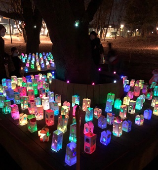 【12月3日・6年生】鶴間公園イルミネーション祭 公開日 2022/12/06 更新日 2022/12/06 学校日記 12月3日に鶴間公園イルミネーション祭が開催されました。本校6年生たちが作った作品も輝いていました。暗闇を照らす光は人の心も明るくします。 6年