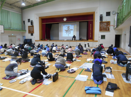 5年生全員で体育館に集まり、みんなで書き初めをしました。