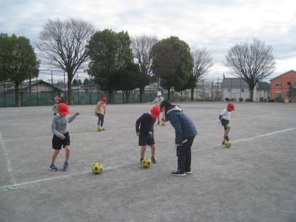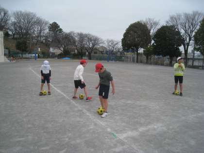 3学期の体育は、校庭で「ボール蹴り運動」の学習をしています。