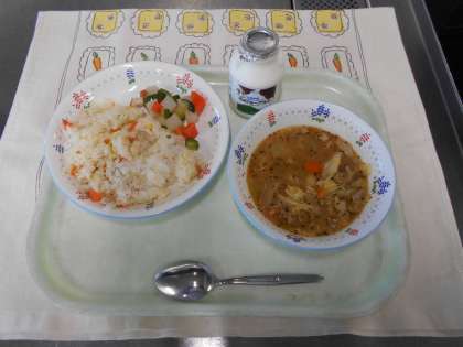 【1月30日のこんだて】 ○トルコ風チキンピラフ ○ピクルス ○レンズ豆のスープ ○飲むヨーグルト