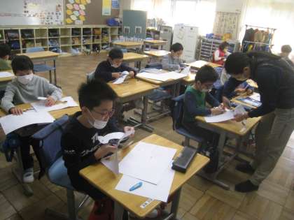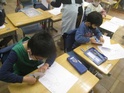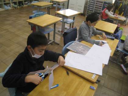 自分で描いた「うさぎ」の絵に合わせて はさみで切り取りました。