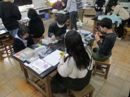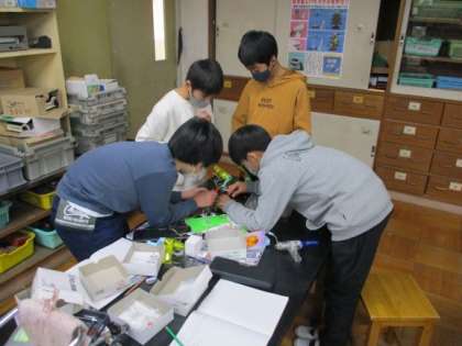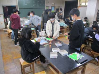 今日は実際に発電して、豆電球を光らせたり、プロペラを回したりしました。直列で手回し発電機を繋ぐなど、工夫しながら一生懸命に取り組んでいました。