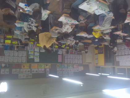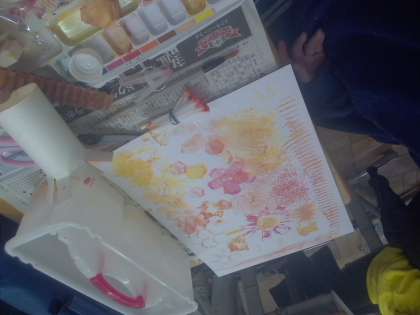 図工の「スタンプ スタンプ」では、ご家庭で準備していただいたカップやスポンジ等の道具を使って思い思いの絵を描きました。はじめは絵の具が上手くつかずに苦戦していましたが、慣れてくると様々な色や形を楽しみながら取り組むことができました。
