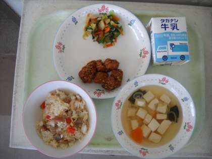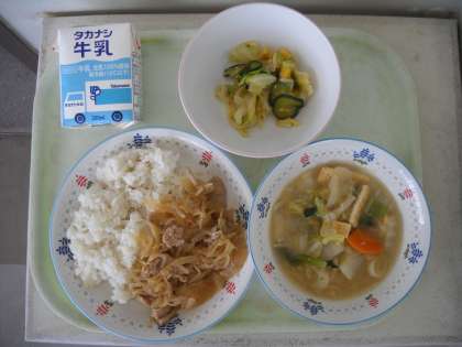 【給食・5月2日】 公開日 2023/05/02 更新日 2023/05/02 学校日記 〔5月1日の献立〕 ・ぶたすきどん・野菜サラダ ・みそしる・牛乳 〔5月2日の献立〕 ・中華おこわ・かつおのごまみそがらめ ・おひたし・すましじる・牛乳 給食