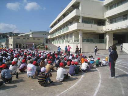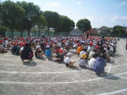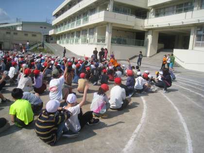 全校で校庭に集まって「新しい先生クイズ」に挑戦しました。
