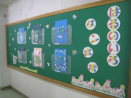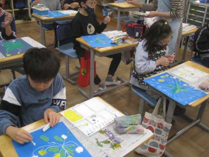 図工では、「春の色 タンポポ」の絵が完成しました。