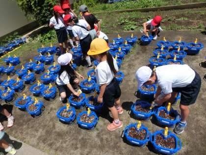 【5月16日・1年生】アサガオの芽 公開日 2023/05/17 更新日 2023/05/17 学校日記 「アサガオの小さな芽が出たよ。」1年生が植えた種から芽が出ました。黒くて小さな種から緑色の芽が出ています。小さな種の中で、どのようなことが起こっているのだろうか、考えてみると不思議ですね。 1年