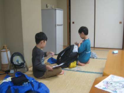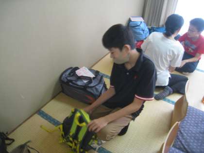 自分の荷物をバッグに詰め込んでいます。