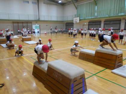 体育では、跳び箱を使った運動あそびをしています。跳び乗ったり、跳び越したり、転がったり、開脚跳びや台上前転につながる基本の動きを遊びを通して学んでいきます。