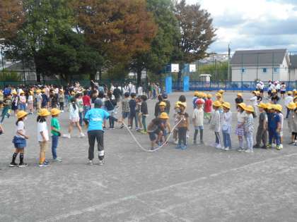 運動旬間で大縄跳びに挑戦しています。八の字で一人ずつ入って跳んでいきます。それぞれのクラスの目標記録に向かって練習をしています。「1、2、ナイス!」「どんまいどんまい!」と応援の声が秋の空に響いています。