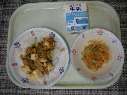 給食 10月13日(金) 公開日 2023/10/13 更新日 2023/10/13 学校日記 10月13日(金) 今日の献立は、マーボー丼、春様サラダ、牛乳です。 マーボー丼には、にんじん、たけのこ等たくさんの野菜が入っていて、もりもり食べられる給食になっています。 給食