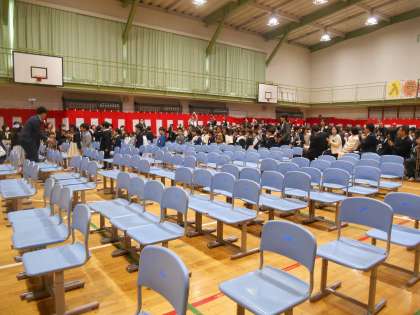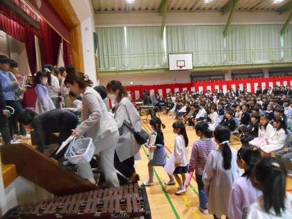 第45回入学式をおこないました。受付を済ませた子供たちは、教室で静かに待っていました。時間になって体育館に入場しました。