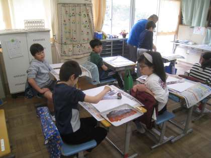 先週見た校庭の桜の様子を思い出しながら、頑張って描いていました。