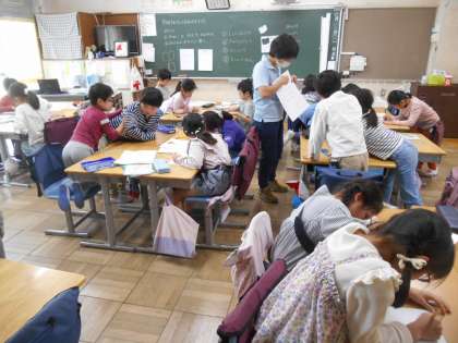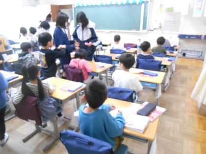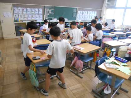 4月24日(水)学校の様子 公開日 2024/04/24 更新日 2024/04/24 学校日記 1年生の様子です。中休み、校庭で遊べないため、室内で折り紙を折ったり、絵を描いたりしていました。6年生が一緒に遊んでいました。 3年生もカードゲームをしたり、絵を描いたりして過ごしていました。 2年生の生活科の様子です。学校探検で行うクイズを作っていました。