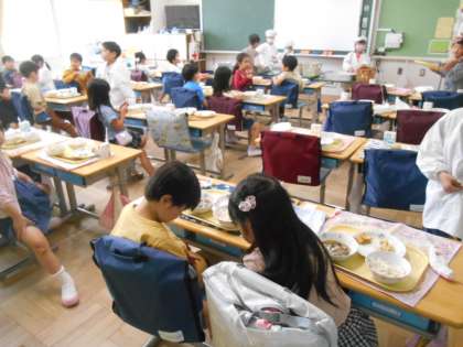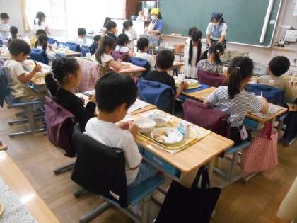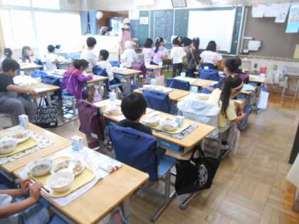 1年生の給食の様子です。配膳も自分たちでできるようになりました。 今日もおいしく食べています。