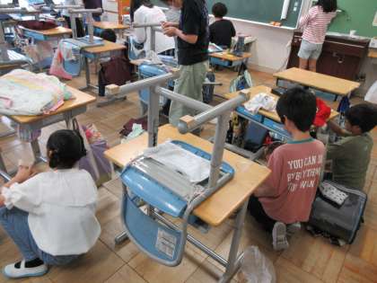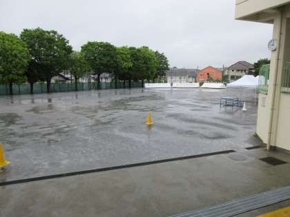 5月31日(土)学校の様子 公開日 2024/05/31 更新日 2024/05/31 学校日記 明日は運動会です。天気予報では、本日午後ぐらいには雨が上がり、明日は晴れマークも出ています。早い段階で雨が止んで、早く校庭が乾くことを願っています。 校庭に出す椅子の足に、砂利が入らないようにガムテープを貼っています。