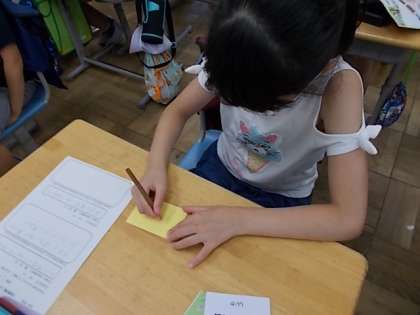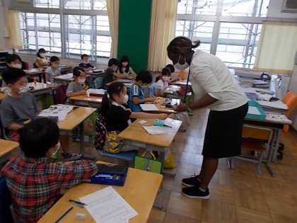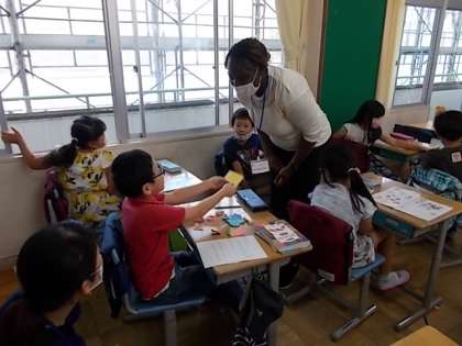 一人ひとりが自己紹介をしながら、ALTのエミリー先生にできた名刺を渡すことができました。