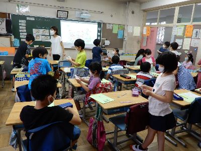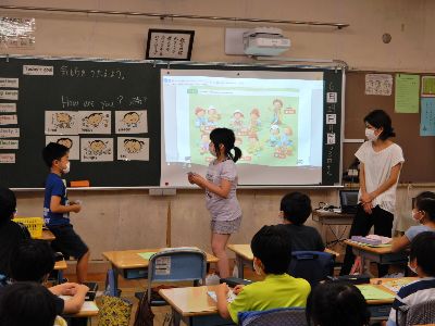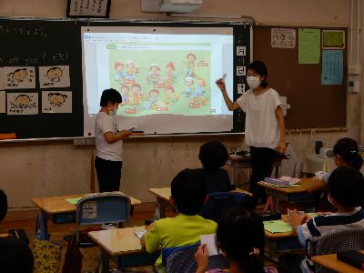 外国語・外国語活動の授業は、授業全体の3割程度の割合で、ALTの先生がつかない担任だけで行っています。こちらのクラスは担任と子供たちでの授業です。会話中心の活動なので対面での活動はお互いの距離を意識して取り組んでいます。