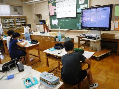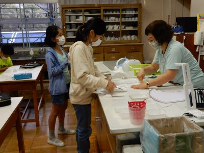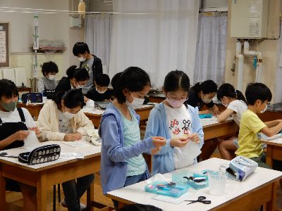 6年生の家庭科では手縫いでマスクを作成しています。当たり前のように使っているマスクですが、自分で作るとなるとかなり大変。なかなか作業を前に進められず苦労しています。工業製品って、すごい!