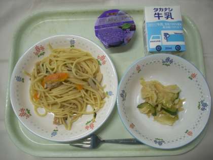 【給食・7月3日】 公開日 2020/07/03 更新日 2020/07/03 学校日記 〔献立〕 ・ツナスパゲッティ ・パリパリれんこんサラダ ・ぶどうゼリー ・牛乳 今日は久しぶりのサラダの登場でした。 子供たちも、もりもり食べていました。 給食